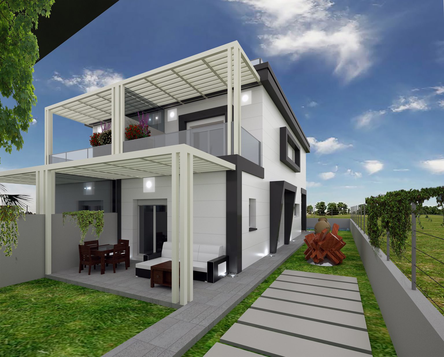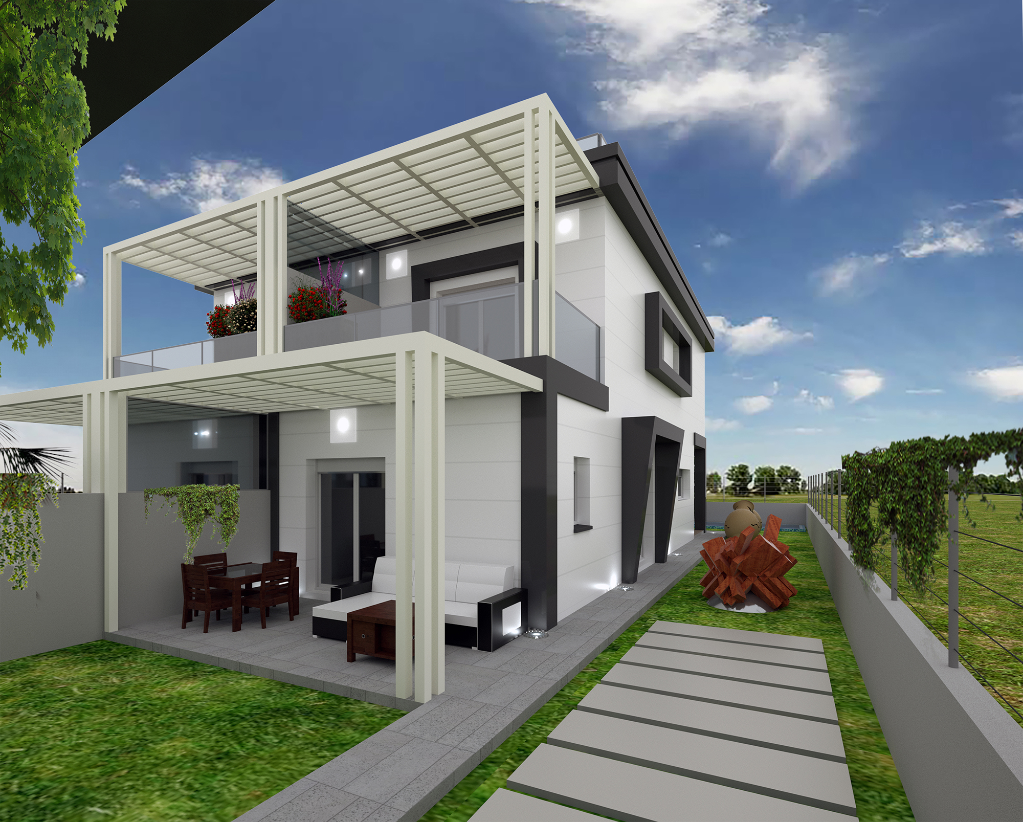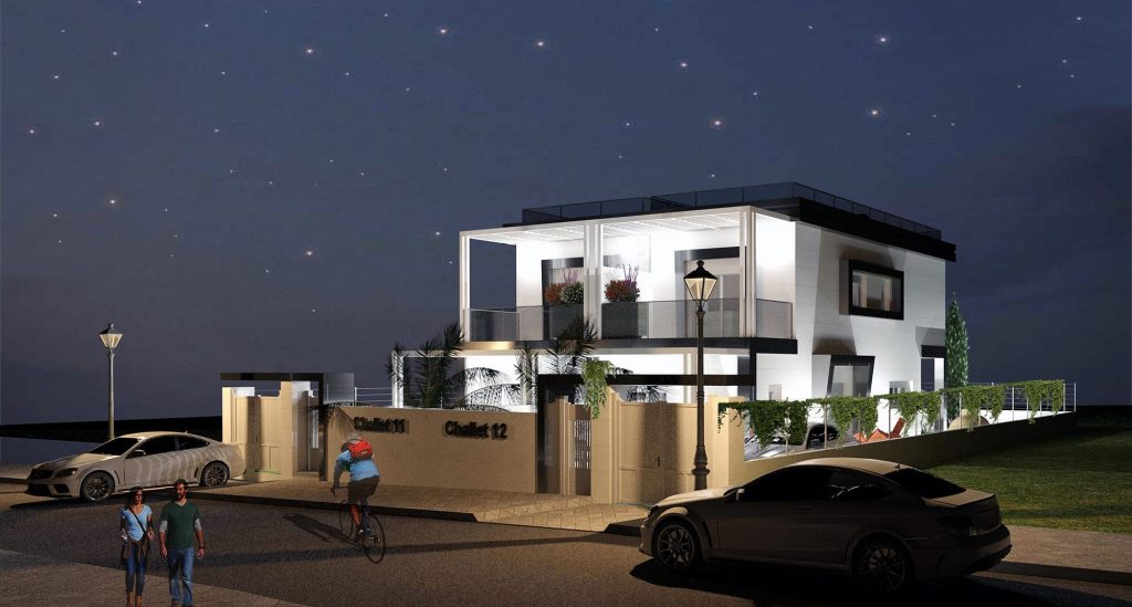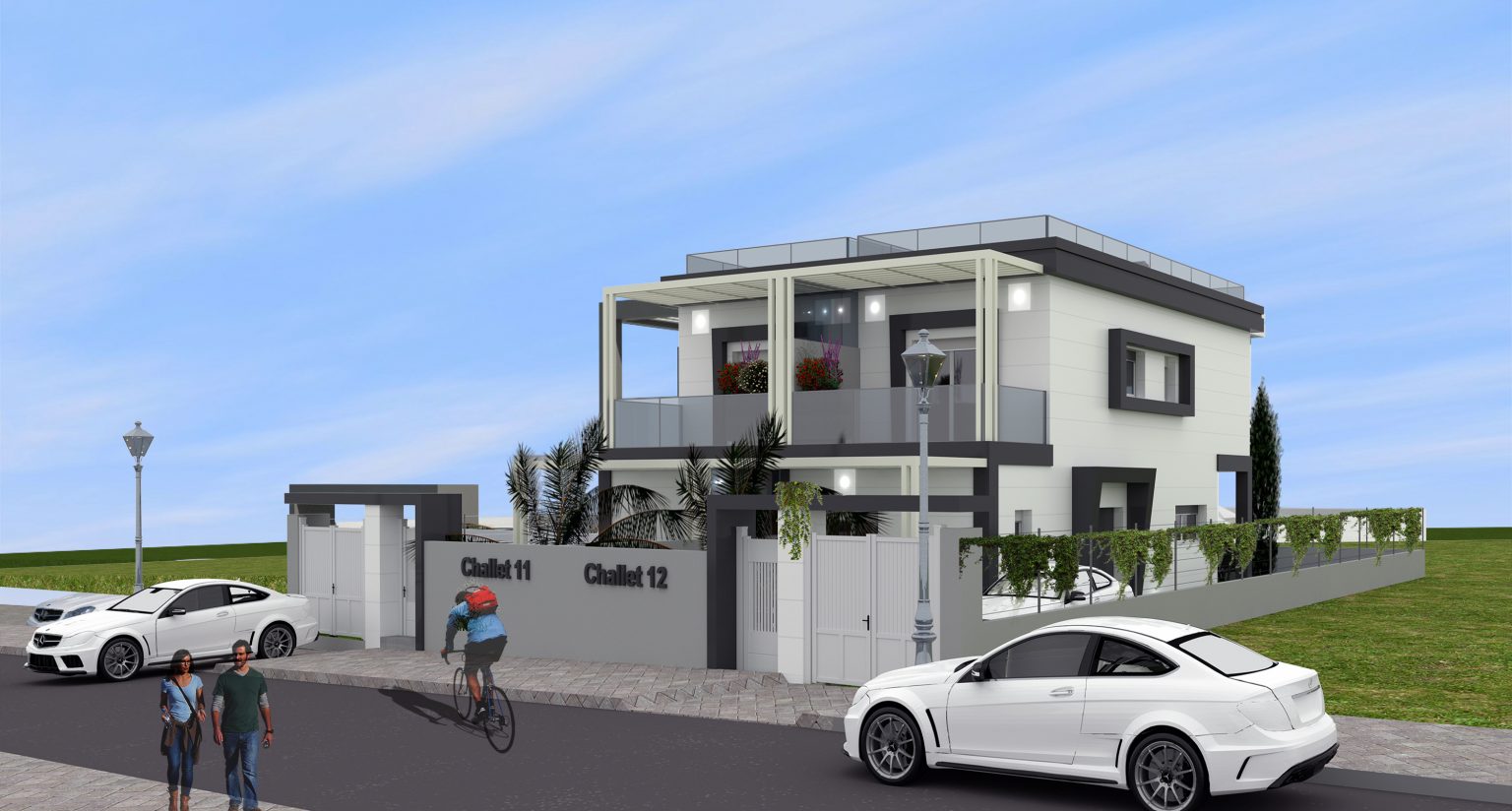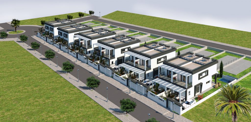 Las viviendas se ubican dentro de la parcela retranqueada de la acera exterior. Dispone de patio delantero destina a zona de estacionamiento y acceso peatonal; patio lateral de acceso a la vivienda, y patio posterior que alberga solárium, y piscina descubierta individual.